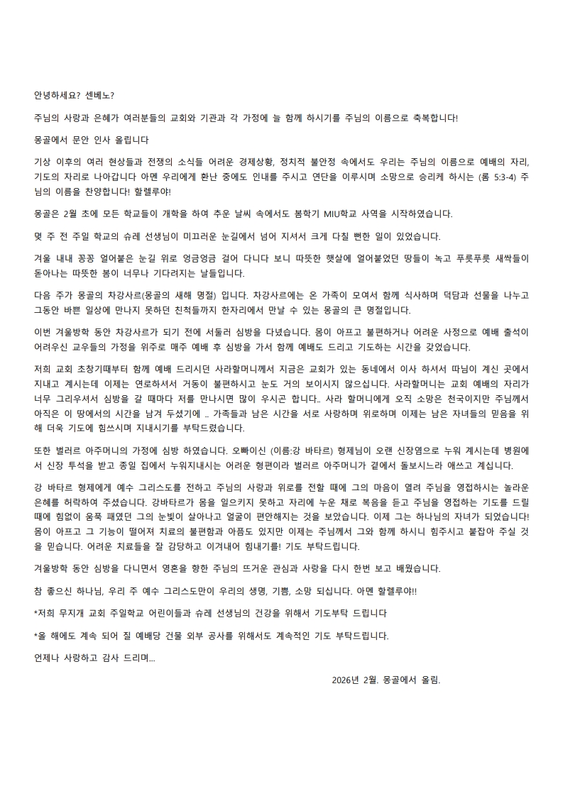몽골에서 온 기도편지를 보내드립니다.(2026년 2월)